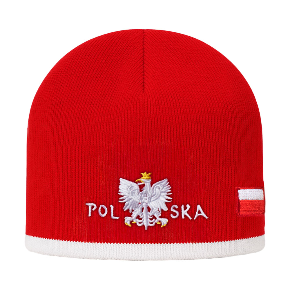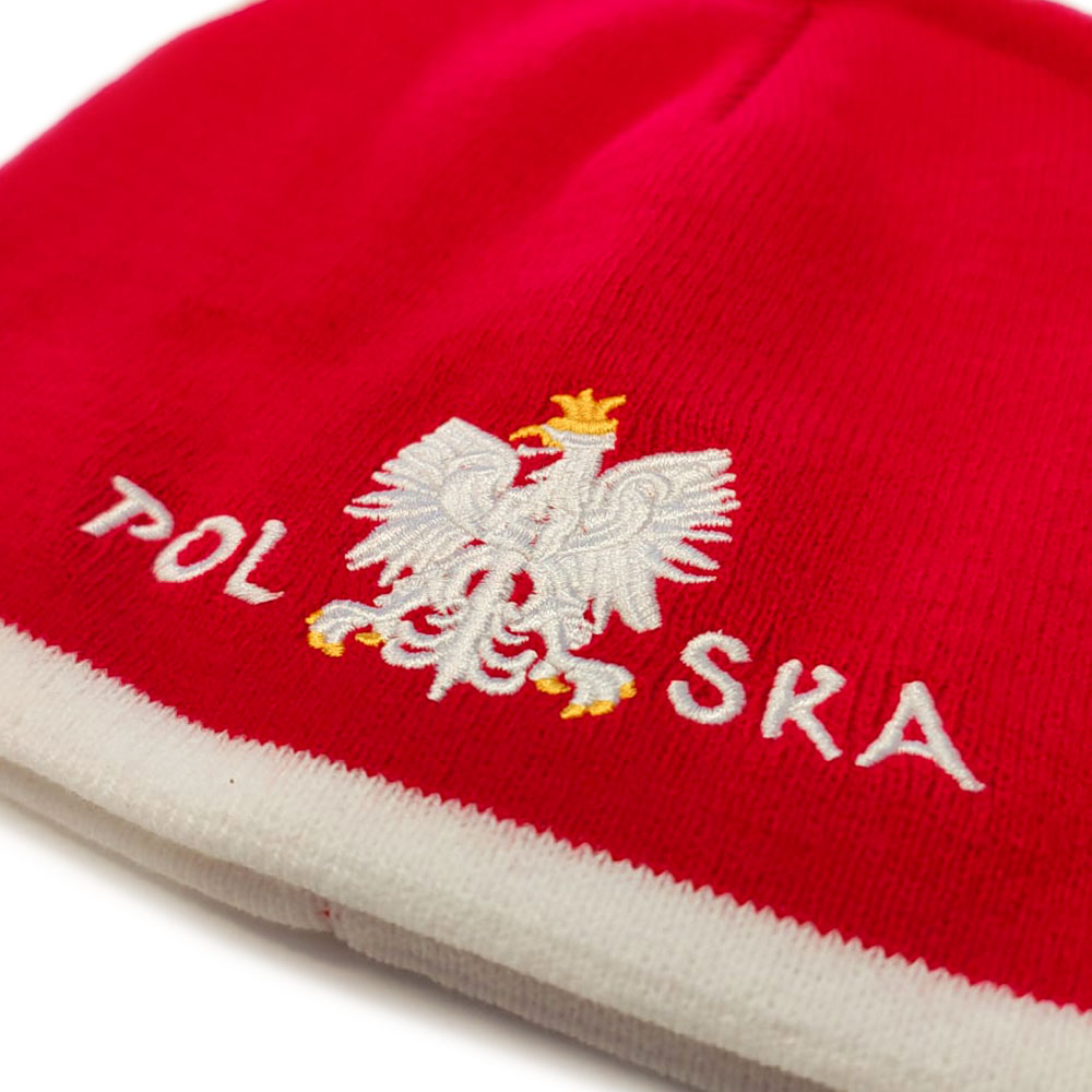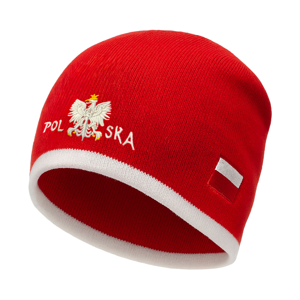RegistrierenWintermütze Beanie POLSKA, 100 % Acryl. Auf der Vorderseite befindet sich der gestickte Schriftzug „POLSKA“. Einheitsgröße, Kopfumfang 54–58 cm.